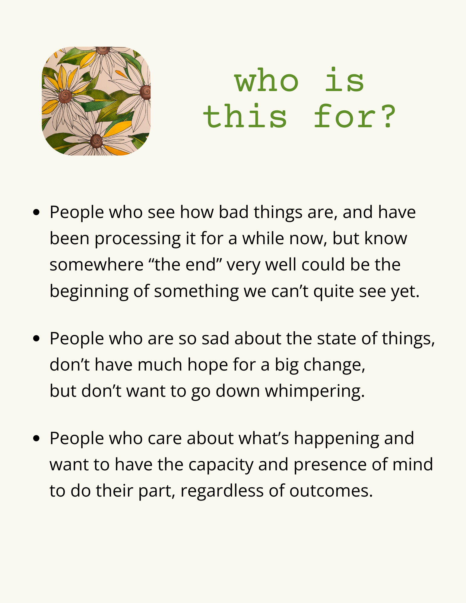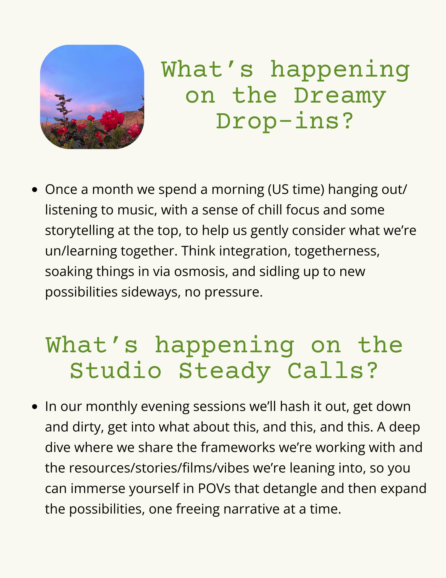 Each month contains two live sessions + a podcast-style transmission on the skills and practices we need to take back our imagination from empire, dream sturdily, and move defiantly towards a weird, wondrous future.