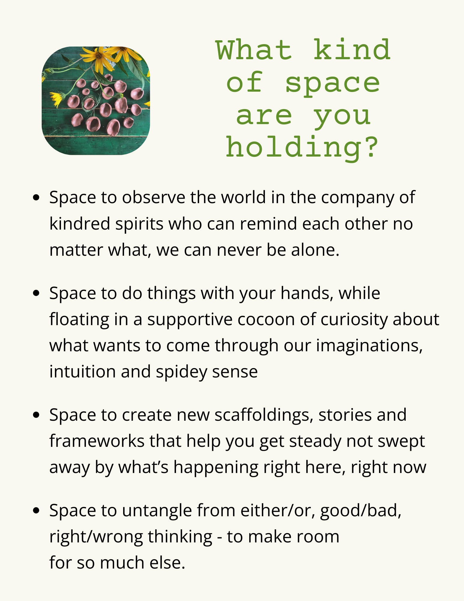 Get grounded in the future. Each month we gather for a morning of rest, co-creation, and grooving together. Free-flowing, responsive, in-the-moment vibes remind us that future is ever-changing, endlessly creative, and always present.