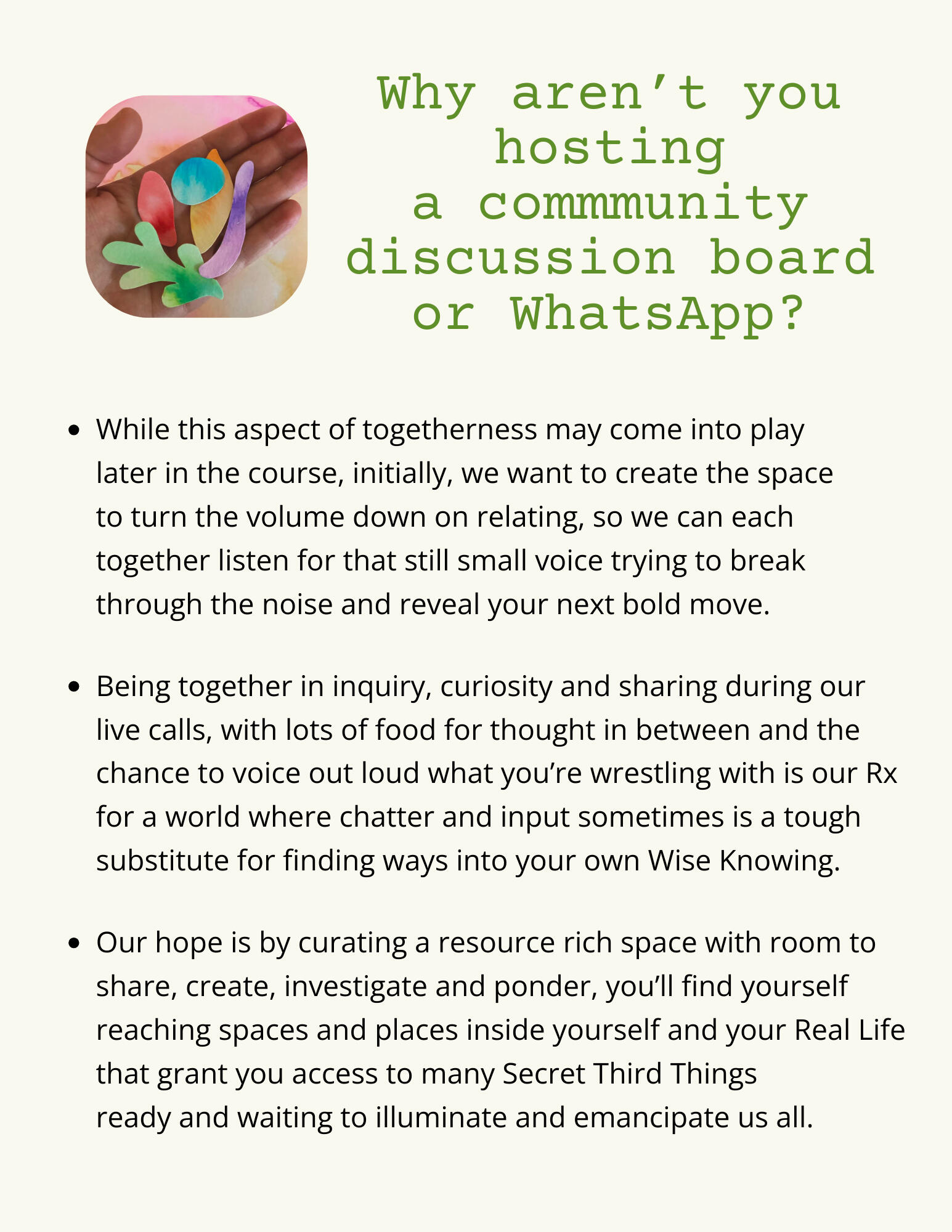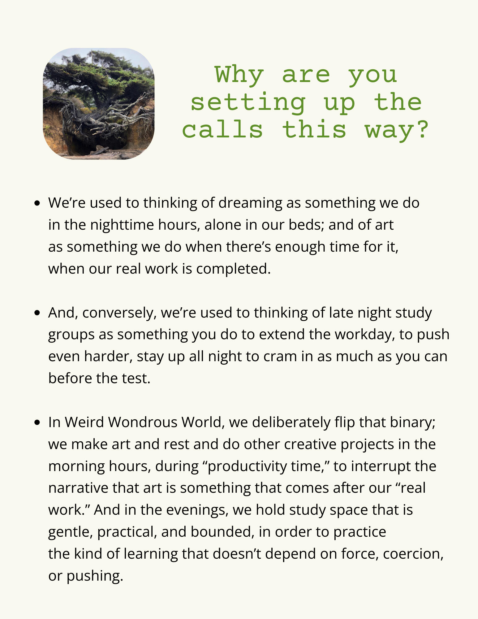 Study group for the future, featuring sleepover vibes. Each month our second drop-in focuses on the concrete resources that help us build the skills to navigate an intuitive, unhinged, but also maybe glorious future.